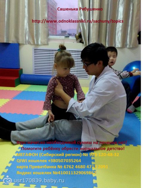 Очень жаль, что времени на лечение у нас очень мало… Особенно после того как проявились первые результаты в речи.., но для улучшений в физике, мы все понимаем, что необходим более продолжительный период, на который у нас к сожалению-нет средств...((( поэтому я обращаюсь к вам снова и снова, дорогие наши друзья, помогите нам! Поддержите Сашуньку пожалуйста, кто чем может-кто перепостом, кто переводом...