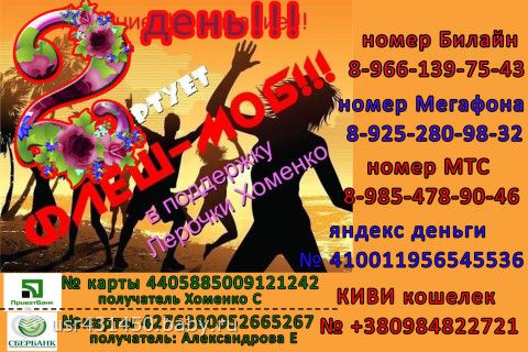 Условия Флеш-Моба просты: отправляете любую посильную сумму на удобный для вас реквезит, даже ваши 100 руб или 25 гривен могут помочь!