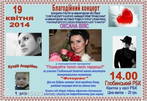 19 апреля 2014 г. в 14.00 состоится благотворительный концерт в Глобинском РДК, цена билета 20 грн. (билеты в кассе РДК).
