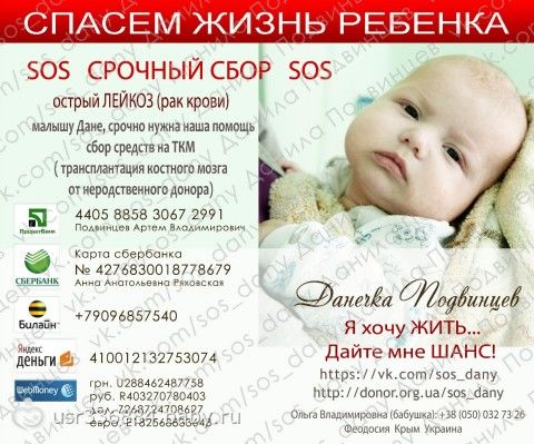 Тяжелая ноша выпала на его долю. Он не помнит родного дома. Каждодневно получает уколы и живет в больнице. У него есть семья, которая его любит и пытается спасти. У него есть мы — добрые помощники. Все беды у Данюшки от злой и беспощадной болезни — рак крови. Даню лечат хорошие Симферопольские врачи, но что бы окончательно выздороветь, ребенку нужно сделать ТКМ от не родственного донора.Такие операции на его родине Украине не делают. Клиника г. Вюрцбурга (Германия) готова принять малыша на лечение и выставила счет на 300 000 евро. Сумма большая. До закрытия сбора еще нужно собрать 274 262 евро по данным отчета за 23.02.2014 г. Сроки поджимают. Не известно сколько Данечка будет находиться в ремиссии. Операцию ТКМ проводят только тогда, когда пациент находится в ремиссии. И отсюда вывод, что бы спасти Данечку, надо действовать очень быстро. Его нужно срочно отправлять в клинику на пересадку. Много, очень много людей откликнулись на призыв о помощи Данечке. Но нужно еще больше отзывчивых людей, что бы успеть. Пожалуйста, рассказывайте об этом ребеночке везде, где только возможно. Ведь помощь бывает приходит от туда, откуда и не ждешь.