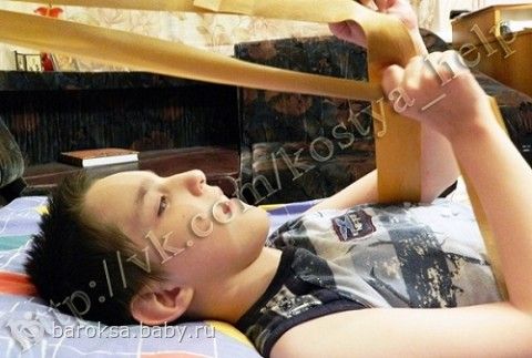 У нас появился новый тренажер. Увидела у кого-то в группе фото, где мальчик занимается с эластичными бинтами. Очень понравилось. Купила бинты, завязала за палку, а палку поставила за спинку дивана на котором спит Костя. Получился, своего рода тренажер на укрепление мышц. В нашем случае, пока только для рук, в дальнейшем и для ног, тоже. Костюшке очень понравилась столь не обычная качалка. И теперь, каждый вечер, в течение 20 минут…
