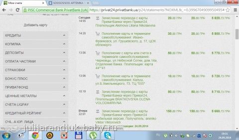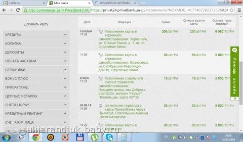 поступление средств на карту ПРиватбанка за 13.-22.09.2014