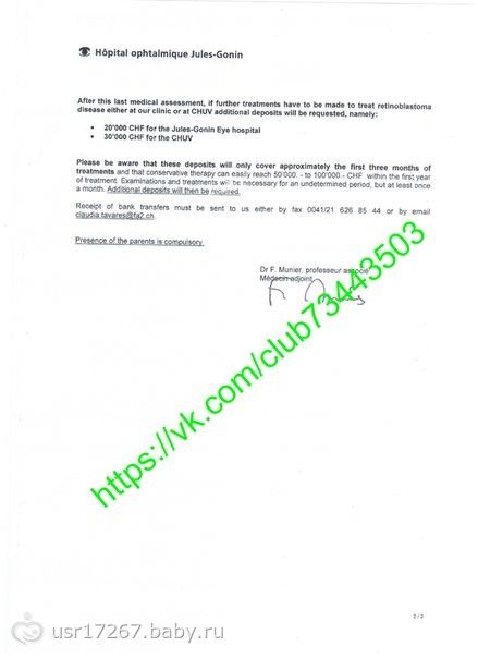 Диагноз: 2-х сторонняя ретинобластома 5 стадии (злокачественная опухоль сетчатки глаз).