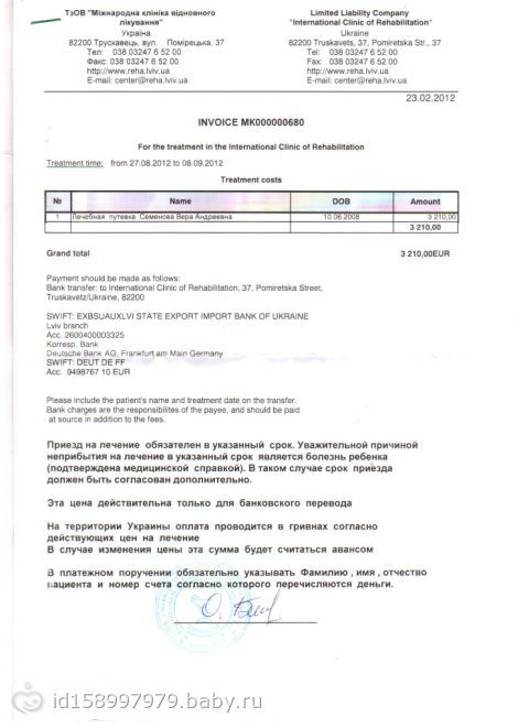 Необходимая сумма — 3 210 ЕВРО лечение и проживание: сюда входит лечение и проживание в клиники, нужно ещё деньги на билеты на самолёт туда и обратно до Львова, а так же на проезд до Трусковца и обратно- это 2000 ЕВРО. В данный момент собраны 1 800 ЕВРО, на счет клиники переведены 1 200 ЕВРО.