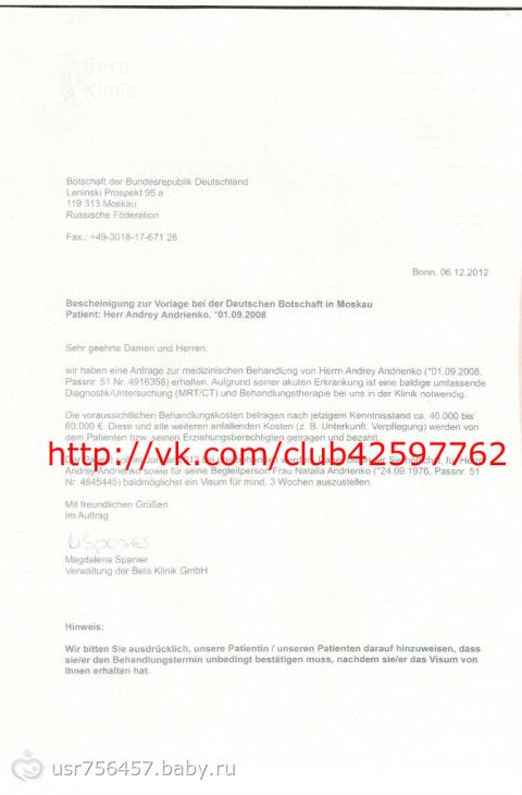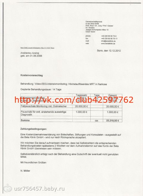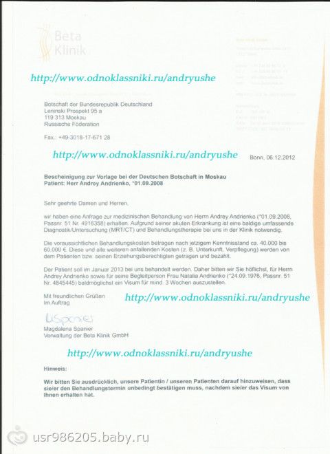 Другая немецкая клиника – Beta Klinik, в которую также были направлены документы Андрюшеньки, наконец-то дала ответ!!! Нашего малыша ждут в этой клинике уже в январе 2013 года. Планируется сразу провести и обследование, и всё необходимое лечение. Ориентировочная стоимость — 60 000 евро (из них обследование 23210 евро вместо 42000 евро в Шон Клиник). В связи этим наш сбор становится ОЧЕНЬ СРОЧНЫМ!!!
