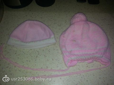 2 шапочки, одна велюровая розовенькая с маленькими цветочками на белом фоне (на 6-10 месяцев), а др. розовая побольше (на 1,5-3 годика)