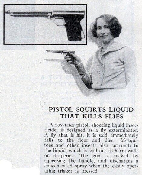 Убийца мух. Пистолет прыскает концентрированной струёй инсектицидов. Особенно весело будет ловить муху, когда она летит к другому человеку.