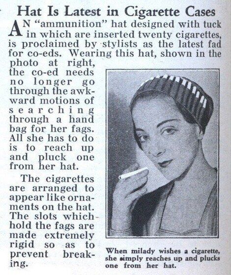 Футляр на 20 сигарет. С такой шляпой вам не надо будет таскать сигареты в руке или в сумочке. «Когда миледи захочет покурить, она просто достанет одну сигарету из свой шляпки.»