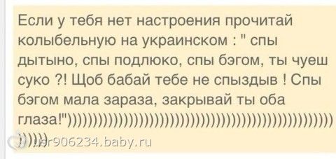 Колыбельная на украинском. Поднять настроение 12 февраля 2014 16:19 Комментарии Пожалуйста, будьте вежливы и доброжелательны к другим мамам и соблюдайте правила сообщества ПожаловатьсяСкопировать ссылку викки Яна17 летСармат15 летВиктория13 лет Владикавказ ПожаловатьсяСкопировать ссылку Мария Смородинка14 летКнопочка11 лет Нижневартовск Вот не знаю что и сказать, и ужасно и смешно одновременно ПожаловатьсяСкопировать ссылку Elena Тупость ПожаловатьсяСкопировать ссылку Варьяна Алиса10 лет Санкт-Петербург ой… умора!!!А если на русский перевести? :)ПожаловатьсяСкопировать ссылку Юлия-zeta451 Козяпуська12 летАпельсинка8 лет Санкт-Петербург да и так все на русском, на чисто украинском звучало бы непонятно ))) чуешь — слышишь значит ПожаловатьсяСкопировать ссылку Ирина Андрюша13 летЕвгений10 лет Киев Странно, странно. ПожаловатьсяСкопировать ссылку Ольга Ксения23 годаИлья20 летДанил12 лет ну оооочень отдаленный украинский!ПожаловатьсяСкопировать ссылку ЁжикВТумане ЛюбимаяДевочка12 лет Санкт-Петербург ну я тоже знаю украинский, я так поняла, что это просто для складности и чтоб русские поняли) ПожаловатьсяСкопировать ссылку Ольга Ксения23 годаИлья20 летДанил12 лет в украинском языке нет слова глаз, слово бегом пишется бігом, оба — обидва (с украинской ы) в общем тупая попытка тупого юмора. Актуальные постыинтернет-роман. развод. а что дальше???не проходит грибок