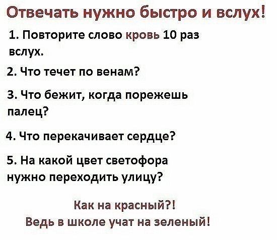 Отвечаем все)))) 31 августа 2011 14:45 ** Я ответила красный))А что ответили вы???))))) Комментарии Пожалуйста, будьте вежливы и доброжелательны к другим мамам и соблюдайте правила сообщества ПожаловатьсяСкопировать ссылку БольшаяЧерепаха СтаршаяЧерепашка25 летМаленькаяЧерепашка14 лет Санкт-Петербург не прокатило(. Зеленый. ПожаловатьсяСкопировать ссылку Вера Виктор13 лет Сыктывкар Красный.... Много таких… Девочки, это значит, что вы легко внушаемый человек ПожаловатьсяСкопировать ссылку Евгения Анечка14 летНастенька6 лет Мегион зеленый ))) я какая-то не такая? ПожаловатьсяСкопировать ссылку Ma-shik Таганрог красный ПожаловатьсяСкопировать ссылку Дельфинка Дельфинёнок14 лет Москва мне сестра недавно это рассказала)) я ответила на зеленый) ПожаловатьсяСкопировать ссылку Linkin Anita Дмитрий14 лет Ставрополь красный)) ПожаловатьсяСкопировать ссылку Светлана Полиночка14 лет Москва на красный ПожаловатьсяСкопировать ссылку Софья Кира16 летЭмма14 лет Подольск Красный ПожаловатьсяСкопировать ссылку ШальнойАнгел Малыш18 летМалышка12 лет Ижевск красный ПожаловатьсяСкопировать ссылку Елена Александр14 летЯна3 года Самара красный ПожаловатьсяСкопировать ссылку эльвира мальвина Даниэль12 летМарат9 лет Набережные Челны красный))) ПожаловатьсяСкопировать ссылку ЯТакаяЛяЛяЛя Катюша12 лет Что-то я не попалась... ПожаловатьсяСкопировать ссылку НиночкаМамаКоржикаи маленькойПирожулинки Даниил15 летМирослава10 лет Иркутск +1 ПожаловатьсяСкопировать ссылку ღЖивуღ вღРаюღ Аделина16 летДарина15 летДиана12 летМилашка6 лет и я((((( ПожаловатьсяСкопировать ссылку Светулёк Анютка14 летНастюша4 годаЛеонид9 месяцев Иваново и я красный ПожаловатьсяСкопировать ссылку КИРСУНЯ Ванечка15 лет Красноград красный Показать ещё12 Предыдущая статьяОй девочки не могу! Может и плохо над этим смеяться, но до сих пор успокоится не могу!Следующая статьяУлыбочку))