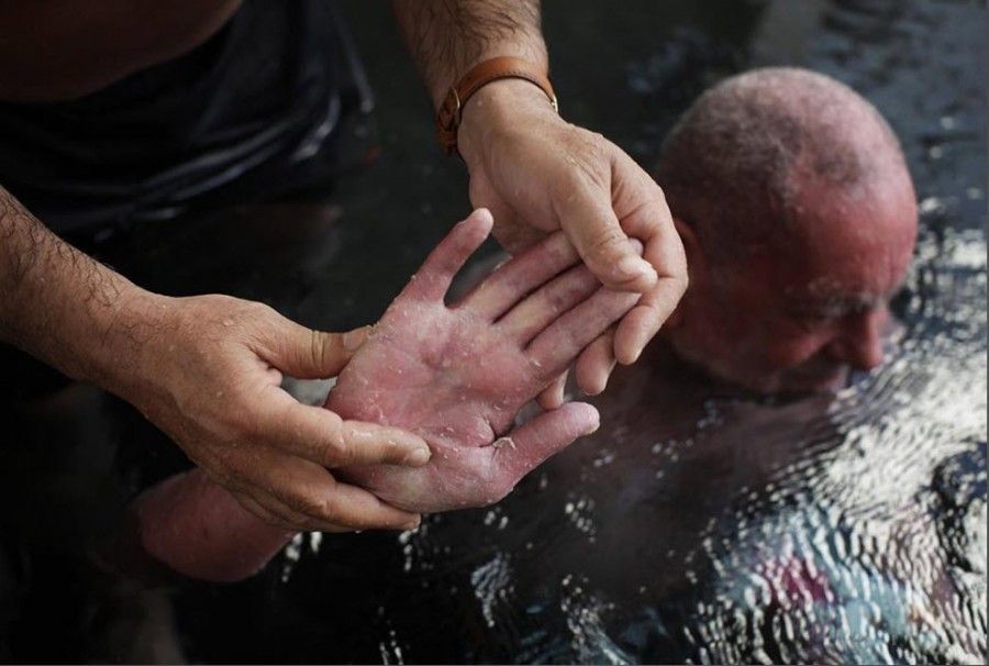 12. Аслан Гангор попросил помощи у своего брата для пилингования пораженной псориазом кожи во время купания в минеральных водах бассейна.