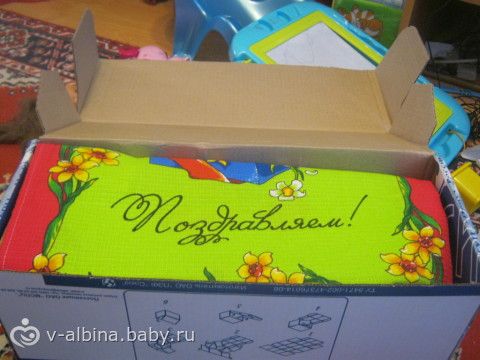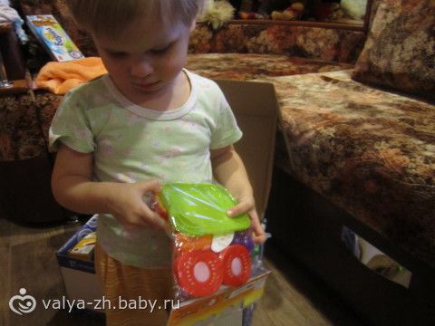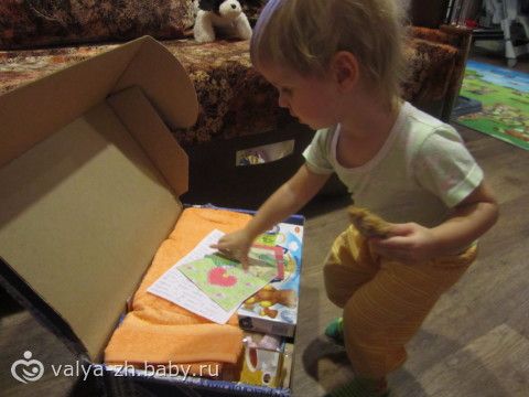 довольная дочка сидит на коробке и говорит, мамааа открывай).