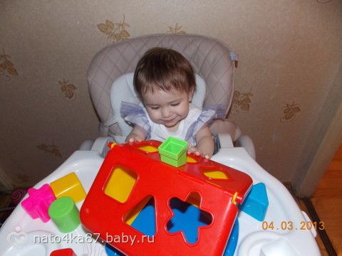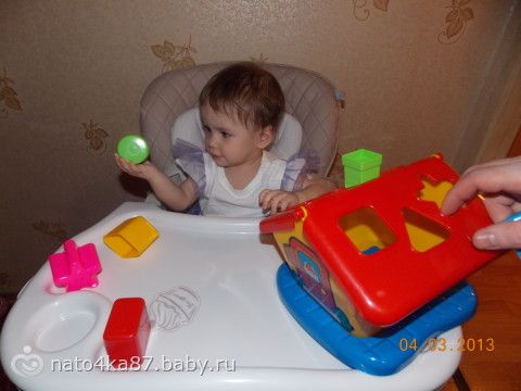 но больше всего ее занимает домик ))) хоть и не понимает пока куда какие фигурки надо бросать, но пытается, а если не получается, то все на пол и весь вопрос решен!!!