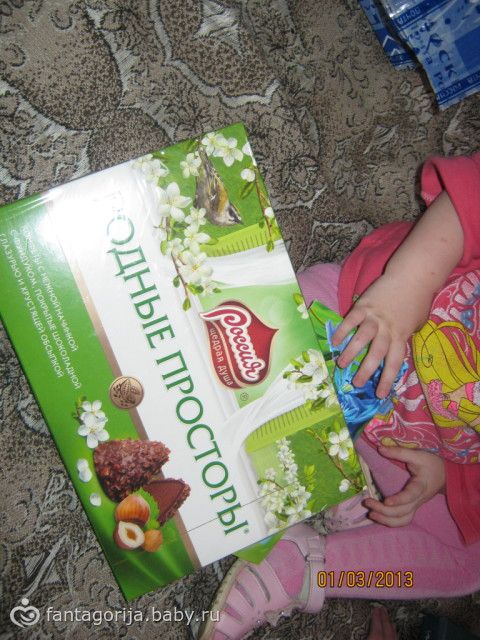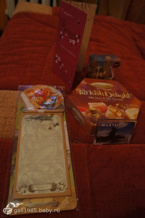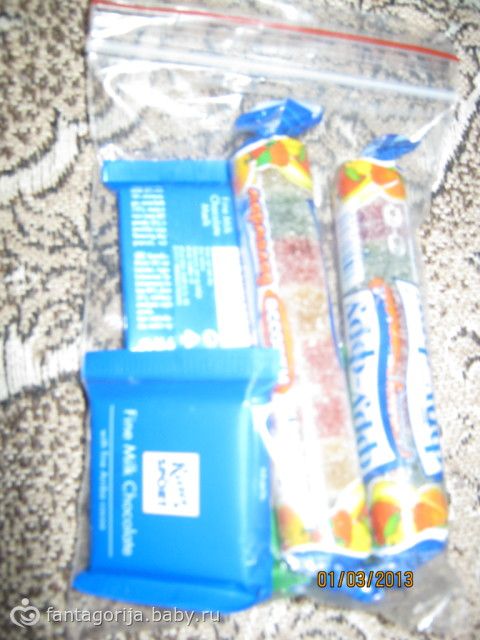 ), киндер шоколад-тоже 2 шт, а еще фру-фру мармеладки и риттер спорт мини-шоколадки))) Вообщем много много сладостей-они так приятно скрашивают этот снежный первый день весны!