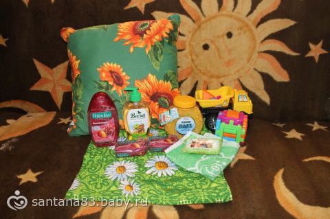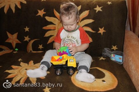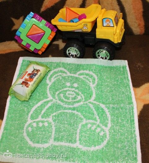 Полотенце с мишкой, детское мыло, машинка-грузовик, такой кубик чудесный, который был стразу разобран и сложен в машинку. Одним словом, Стасе понравился подарок, он сразу разобрался как с этим поиграть, он очень любит перекладывать мелкие предметы, а тут еще и возил их в машине!