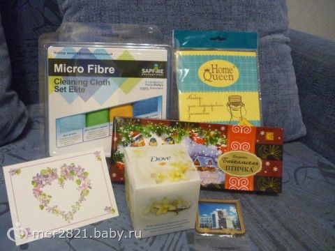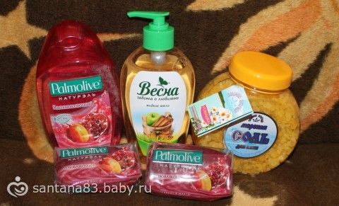 Различные мыльно-рыльные принадлежности, кстати очень угодила нам дарительница, как раз мыло закончилось, все забывала купить, а оно вот и пришло, очень вкусно пахнет гранитиком и гель для душа с таким же запахом, они были в подарочной упаковке, но она, к сожалению, не выдержала дорогу, поэтому я не фоткала ее, еще мыло жидкое весенне, прямо к первому дню весны и соль для ванны, полотенце с ромашками и подушечка такие классные тоже прямо весенние яркие! Это все я присвоила себе, ну, может с мужем поделюсь, подумаю еще!!!