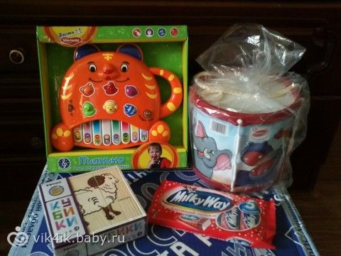 Здесь барабан, детское пианино, кубики и вкусняшка=))))