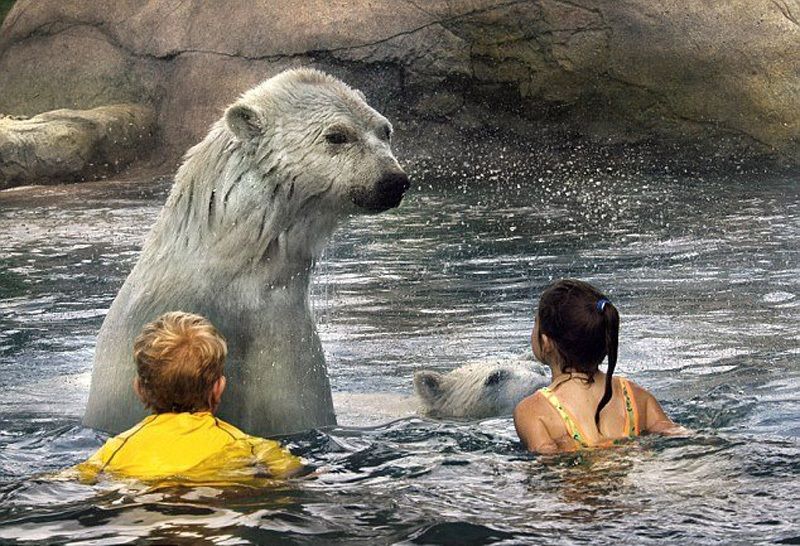 Это очень популярное развлечение в зоопарке Polar Bear Habitat, который находится в канадском городе Кокрейн. Всего лишь за шесть месяцев «бассейн с медведями» посетило 11000 человек. Для создания такого аттракциона понадобилось долгих 20 лет. Но организаторы добились желаемого эффекта – иллюзии полной свободы, хотя людей и хищников разделяет толстое пуленепробиваемое стекло.