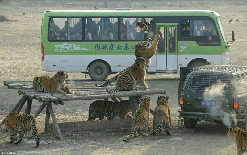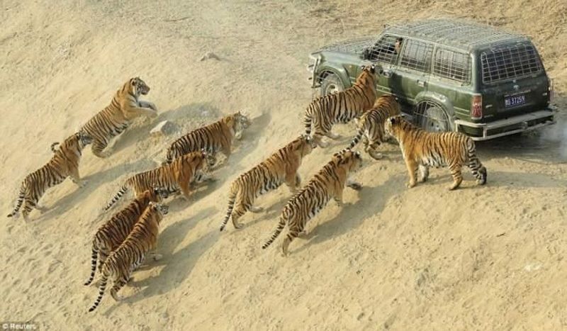 2. Посетителем предложено прокатиться на специальном автомобиле или автобусе по парку с тиграми. Хищники никогда не оставляют транспорт без внимания и пытаются его вскрыть, чтобы познакомиться с пассажирами поближе. Незабываемые ощущения и воспоминания гарантированы.