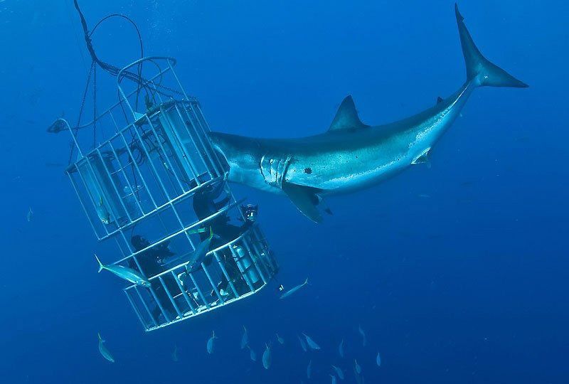 Так называется забава, которая предлагается для всех желающих. Клетка, сделанная из прочного прозрачного материала, опускается с людьми в аквариум, где проживают пятиметровые хищники.