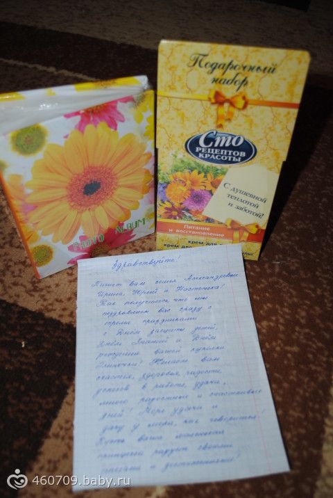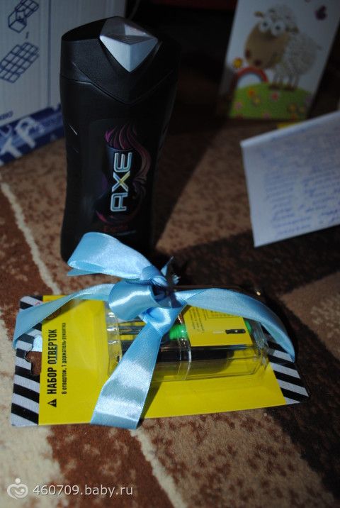 отдельное спасибочки за письмо! обожаю письма, и столько приятных слов было в нёмИ для нашего папы подарки были!!! набор отвёрток и гель для душа, с оч.приятным запахом мм.От мужа привет и спасибо огромное!
