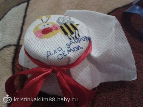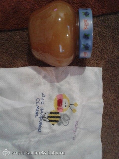 Вот он мёд, который моя дарительница сама собирала))) И вышивка ручной работы с пчёлкой и надписью «Бэби.ру»)))