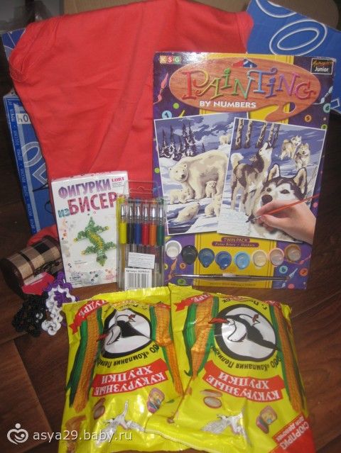 раскраска по номерам, набор ручек, шкатулочка, а в ней резинки для волос, майка пришлась в пору… думаю еще этим летом успеет поносить, набор для поделки фигурки из бисера.