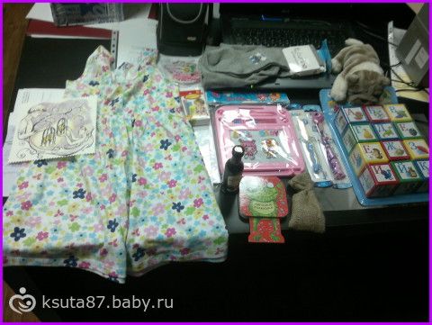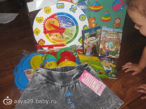 юбочка (великовата, но велико не мало, подрастем будем носить), мягкие пазлы, набор посуды (был распотрошен в первую очередь!!), часы с цифрами и временами года (прикольные, скоро будем учить), фломастеры и 3 книжечки — это мы ооочень любим!!!