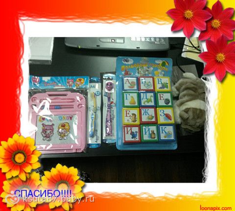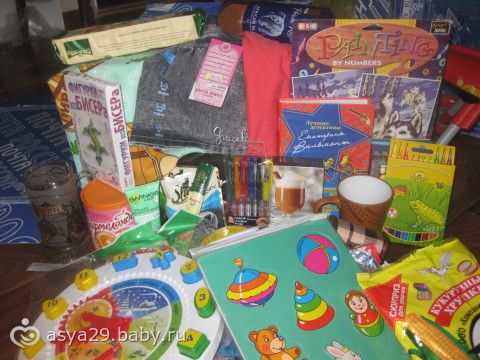 Магнитный планшетик, зубные шетки, кубики, мягкая игрущка!!!!СПАСИБО, ИРИС!!! Много эмоций принес твой чудесный подарочек!!! Все очень нужное!!! Дети довольны!!! МИЛЛИ и тебе спасибо за праздник!!!!