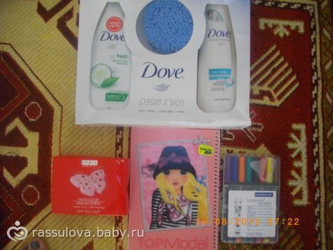 Это подарочки для Настёны (старшей)- ручки, тетрадь… С тетрадью хохма получилась — я её крутила-вертела, думаю, наверное, бракованная. А потом доходит — на иврите же пишут справа налево — зеркальное отражение для нас. Спасибо, Оленька, Настёна сказала, понесет в школу — удивит. Еще для Насти косметический набор, подарочный набор Дав, извиняюсь, на фото нет еще косметического карандаша