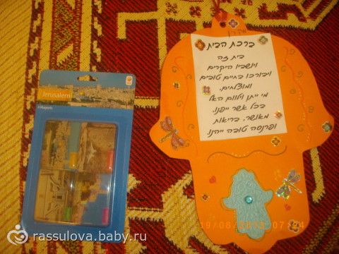 Очень понравились и поразили серебряные наборы для меня и старшей дочери. Фото всю красоту не передает. Оленька, спасибо огромное — шикарные!Огромное мягкое полотенце, магниты (пополнят мою коллекцию, на холодильнике живого места не уже))) и… Символический подарок Биркат-а-байт — благословение дома.Этот оберег (можно его же так назвать?) сделала своими руками Олина доченька Карин. Милая девочка, солнышко, спасибо тебе большое за такой подарочек, ты умничка. Я этот талисманчик повесила на видное место и показала всем друзьям и прочитала перевод, который вы с мамой написали в письме. Спасибо тебе, Карин.