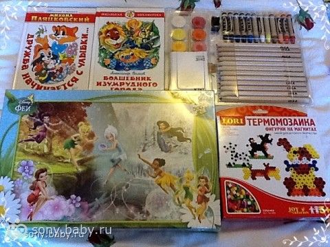 две книжечки для старшей дочи, пазлы(скорей всего мне будут), термомозайка для обеих, и набор цветных карандашей, цветных восковых мелков и краски, тоже будут вместе рисовать.