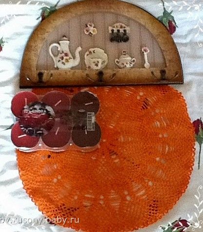 Верхняя штучка, это крючки на кухню для полотенец, у меня как раз нет, полотенца по всей кухне лежат. Свечи с ягодным вкусом и салфеточка связаная крючком (очень приятно).