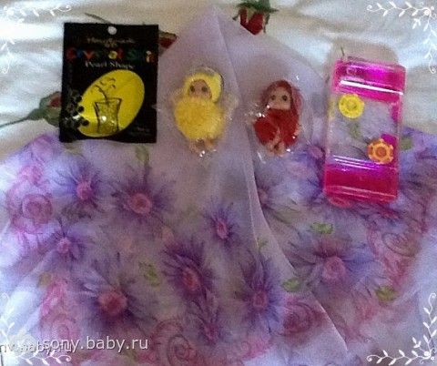 Гидрогель для цветов, две ляльки, декоративные масляные часы, и нежный шарфик.