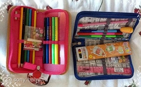 полностью собранные: карандаши, фломастеры, линейки, точилки и стёрки.