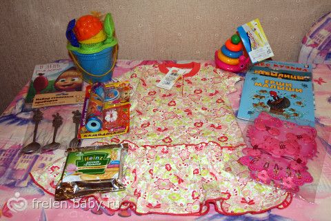 Подарки для дочки Машеньки: набор для песка (отвезем на дачу, там как раз хотим поставить песочницу), пазл-открытка С Днем Рождения (дочке исполнилось 2 годика в августе), набор столовых предметов (у нас до сих пор такого даже нету, все собиралась купить..),калейдоскоп с драже и стикерами Фиксики, печенье Heinz (дочка такие обожает), замечательное платьице на следующее лето, пирамидка-улитка, 2 книжечки с потешками и 1 со стихами с наклейками (будем читать на ночь), набор заколочек и резиночек (всегда пригодятся)