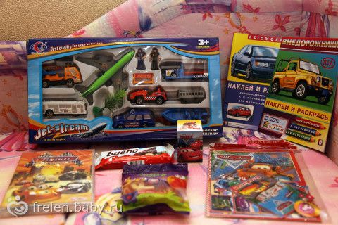 Далее подарки племяннику Алешке: большой игровой набор, 2 книжки-раскраски с наклейками, подарочный набор Тачки, диск с мультиками Тачки, шоколадное яйцо, вафли Киндер и жевательный мармелад. Уверена что племяшка будет в восторге!
