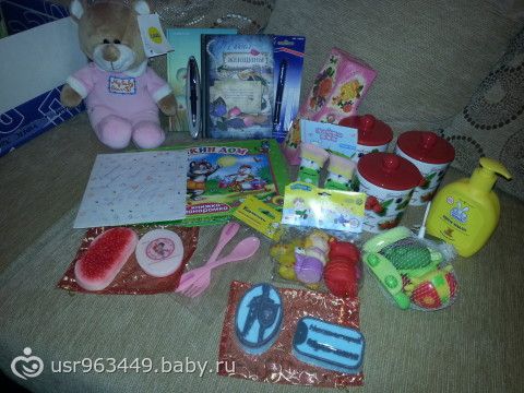 Для Мирославушки гель Ушастый нянь, красивые носочки, 2 набора резиновых игрушек для ванны, ложечка с вилочкой, офигенная книжка-понорамка «Кошкин дом» и медвежонок. За медведя