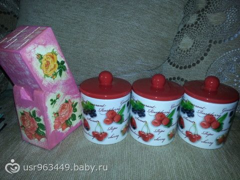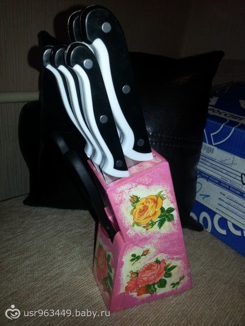 А это 3 потрясающие баночки для сыпучих продуктов и подставка для ножей РУЧНОЙ РАБОТЫ!!! Золотые руки у нашей дарительницы! Я все на нее наглядеться не могу. Почему у меня руки не оттуда растут?((У мамы моей как раз был новый набор ножей, который был быстренько туда вставлен и забран мною себе)) Вот что получилось. По-моему здорово!