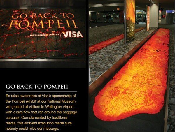 Транспортер в аэропорту – реклама выставки, посвященной извержению Везувия и гибели Помпеи