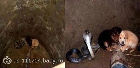 Инцидент произошел в индийском штате Пенджаб. Два щенка провалились в колодец. Их четвероногая мама бегала возле колодца и беспрерывно лаяла, чем и привлекла внимание хозяина, который заглянув внутрь был сильно удивлен – на дне находилась королевская кобра, которая не представляла угрозы для малышей. Более того, рептилия как-бы присматривала за щенятами, не позволяя перейти на другую сторону, где они могли утонуть, когда колодец наполнится водой.