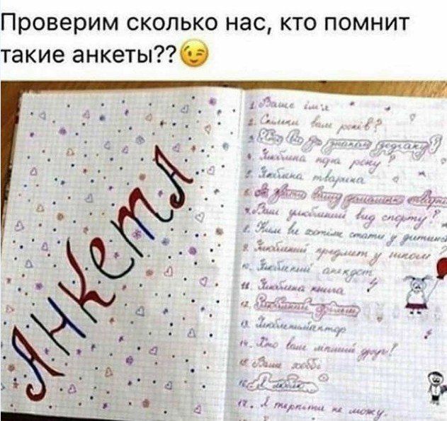 Анкета) 15 августа 2020 17:20 У меня была такая! Самый важный вопрос всегда был в конце:«С кем хочешь дружить?»))) И как правило отвечали :«С тобой!»))) Комментарии Пожалуйста, будьте вежливы и доброжелательны к другим мамам и соблюдайте правила сообщества ПожаловатьсяСкопировать ссылку Eskimo Сын7 летСын3 года Да, и у меня была такая ? ПожаловатьсяСкопировать ссылку Татьяна Софья18 летЯков8 лет Волжский Оо! Была и не одна. Покупались самые клевые тетрадки. Еще такие же песенники были ? ПожаловатьсяСкопировать ссылку Анна Старшая13 летМладшая4 годаСын2 года Кострома Почти у всего класса были такие) ПожаловатьсяСкопировать ссылку МечтыСбываются Анютка11 лет Помню конечно. ) ПожаловатьсяСкопировать ссылку баНана Xreнaнa Анкету помню, была, а вот вопросы, к сожалению, уже не помню ПожаловатьсяСкопировать ссылку Катёна Иван7 летАнна5 лет Волгоград Ооо, я делала кучу таких! Они до сих пор у мамы лежат! И заполнять тоже обожала! ПожаловатьсяСкопировать ссылку Александра Ева5 летДавид4 года Москва Помню помню))) сколько таких анкет перезаполняла и делала сама?? Предыдущая статьяМосква, Алтуфьево - ЛианозовоСледующая статьяА вы уже загадали желание?)))Актуальные постыадаптовитколяска адамекс катрина