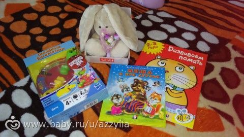 А игрушки нам очень понравились))) В зайца я влюбилась сама))) Скажу одно, букетик лежит отдельно, а вот зайка спит с Варюшей) Очень интересная игра бегемотики) Папа сразу вспомнил детство и ай-да с ребзем гонять шарики))) Книжка про Мишу теперь читаем каждый день)) красочная и интересная) а вторая обучающая — вообще хит) Дочь до дрожи в коленях любит наклейки))) Вот интересно, наша дарительница телепат?