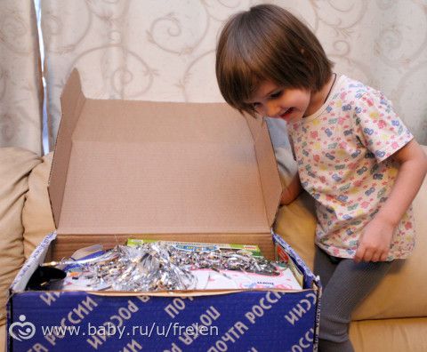 Девочки!))) Ну вот и наша посылочка пришла))) Забрали еще 3 дня назад, но т. к. проходим комиссию в сад в бешеном темпе, минутка появилась только сейчас!!!Дорогая наша дарительница Юлечка, Катюша и Миша! Огромаднейшее спасибо, Вам, за настроение к Старому Новому Году))) Итак, получила извещение еще в субботу, еле дождалась окончания выходных и в свободную минутку побежала на почту! Нас ждала коробочка из Москвы)) Как только зашла в дом, доченька начала шуметь))