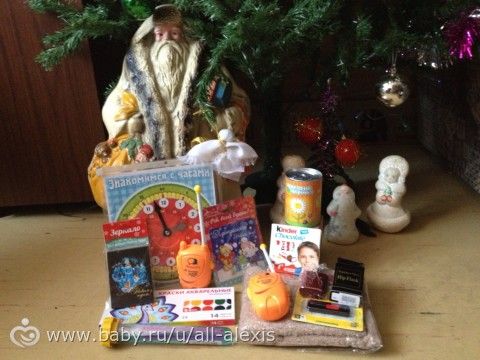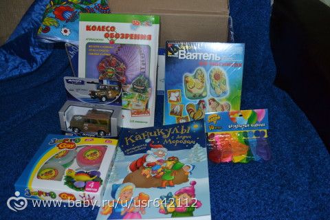 Много всяких штучечек интересных. Теперь поподробнее=) Это для сыночка, самого главного получателя подарочков=) Гипс для созхдания магнитиков, 3Д пазл -колесо обоРзения (это я всегда так его называю))) пластилин — такой мягкий и приятный на ощупь, книжечка с наклейками и заданиями что нибудь разукрасить и конечно шарики-от шариков осталось 4 штучки)))) И машинка — я в них не понимаю (по мне машинка и машинка), когда достали муж сказал — Ого -клевая машинка -муж в этом понимает больше, и сын оценил также как папа)) замечу что она железная, а значит проживет в руках моего сына чуть больше пластиковых))))) что не может не радовать)