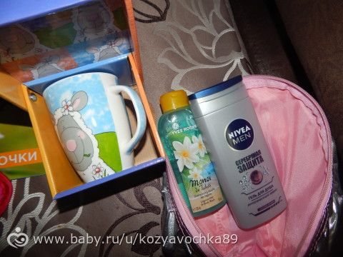 Для меня набор кухонный (прихватки+фартук), вафельное полотенце, красивый и яркий календарь, а так же косметичка, в которой был гель для душа Yves Rocher! Для нашего папули — набор отверток, кружка в коробочке с милой овечкой и гель для душа Nivea!