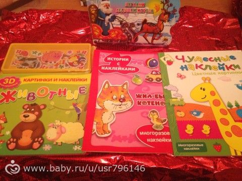 Книжечки)это мы очень любим, одна Про Деда мороза, еще про Животных (Макс их очень любит).А так же 2 книги с чудо наклейками- одно из любимых дел Максима это клеить наклейки