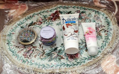 Теперь подарочки для меня (гобеленовая салфетка на стол, зеркальце, свеча, гель для для душа, крем для рук):