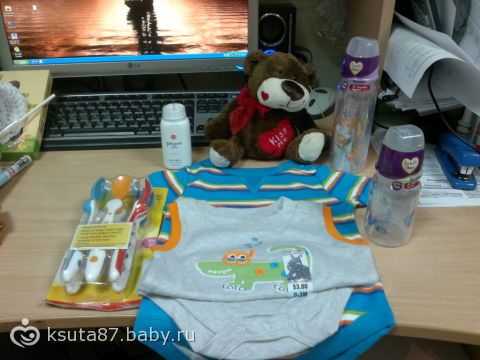 игрушка, присыпка, 2 бутылочки, 2 бодика, ложечки