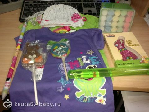 2 футболочки, шоколадный и карамельный леденцы, шапочка, мелки, заяц шоколадный, мыльные пузыри, огромный карандаш!!!!